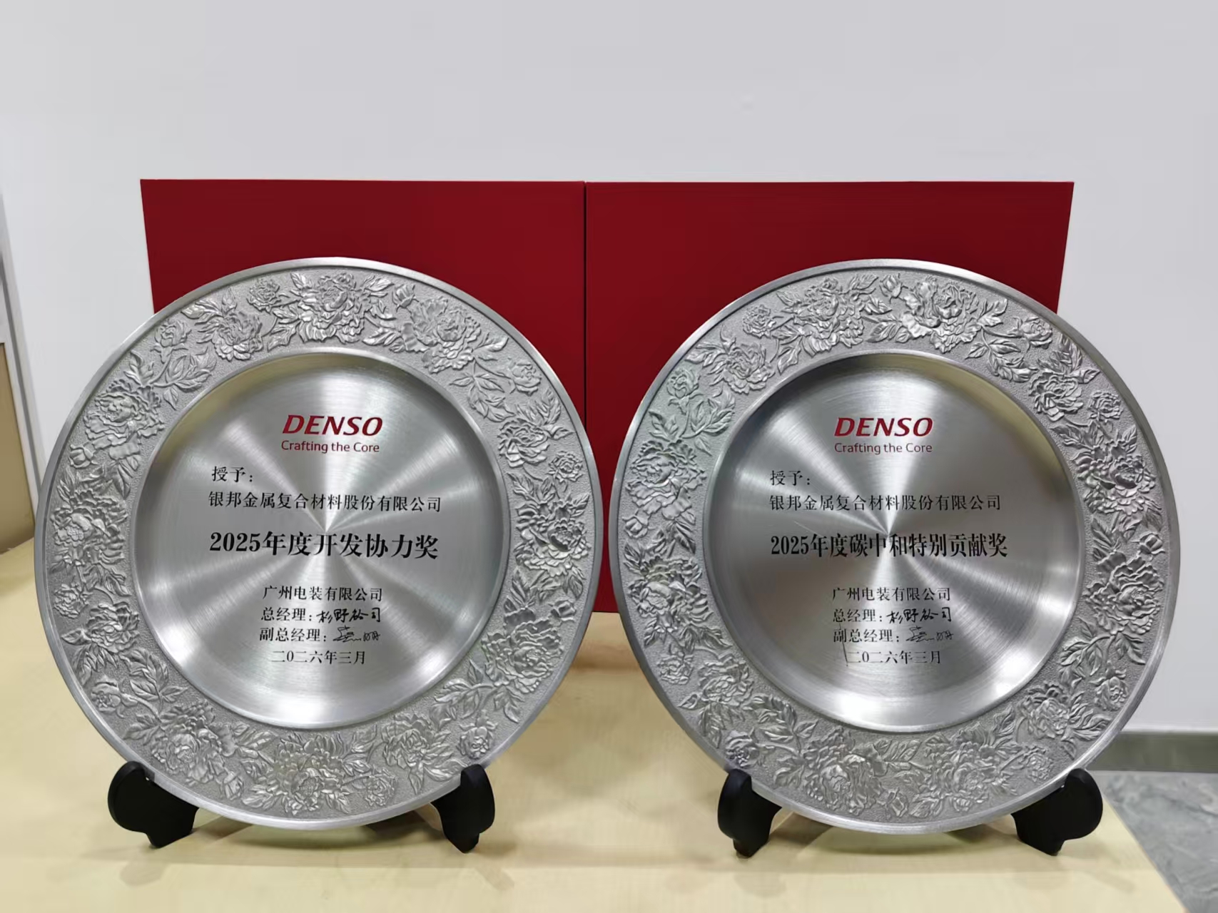 银邦股份荣获广州电装“开发协力奖”和“碳中和特别贡献奖” 新闻动态 | 2026/3/23 银邦股份荣获广州电装“2025年度开发协力奖”和“2025年度碳中和特别贡献奖” 上一条:三花汽零与银邦股份签署战略合作协议 上一条:2026汽车散热器新材料新技术应用研讨会圆满落幕
